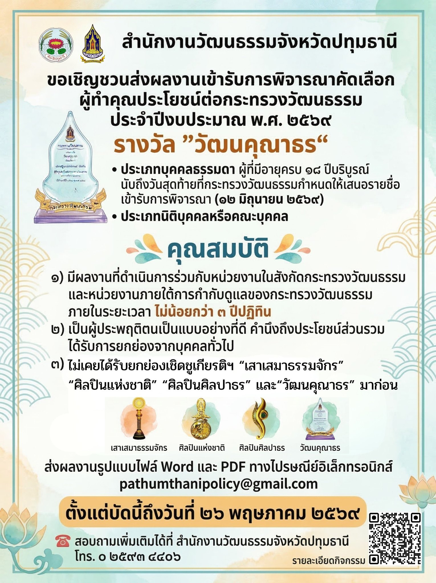 สำนักงานวัฒนธรรมจังหวัดปทุมธานีขอเชิญร่วมเสนอชื่อบุคคลหรือองค์กรที่มีผลงานโดดเด่นด้านศาสนา ศิลปะและว…