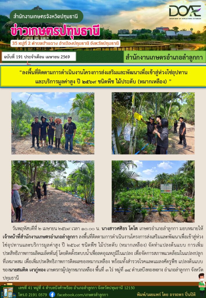วันพฤหัสบดีที่ 2 เมษายน 2569 เวลา 10.00 น. นางสาวศศิธร โคโต เกษตรอำเภอลำลูกกา มอบหมายให้เจ้าหน้าที่สำนักงานเกษตรอำเภอลำลูกกา ลงพื้นที่ติดตามการดำเนินงานโครงการส่งเสริมและพัฒนาเพื่อเข้าสู่ห่วงโซ่อุปทานและบริการมูลค่าสูง ปี 2569 ชนิดพืช ไม้ประดับ (หมากเหลือง) จัดทำแปลงต้นแบบ การเพิ่มประสิทธิภาพการผลิตเมล็ดพันธุ์ โดยติดตั้งระบบน้ำเพื่อลดอุณหภูมิในแปลง เพื่อจัดการสภาพแวดล้อมในแปลงปลูกที่เหมาะสม เพื่อเพิ่มประสิทธิภาพการติดผลของหมากเหลือง พร้อมทั้งสำรวจโรคและแมลงศัตรูพืช แปลงต้นแบบของนายสมคิด เงาภู่ทอง เกษตรกรผู้ปลูกหมากเหลือง พื้นที่ 3 ไร่ หมู่ที่ 14 ตำบลบึงทองหลาง อำเภอลำลูกกา จังหวัดปทุมธานี